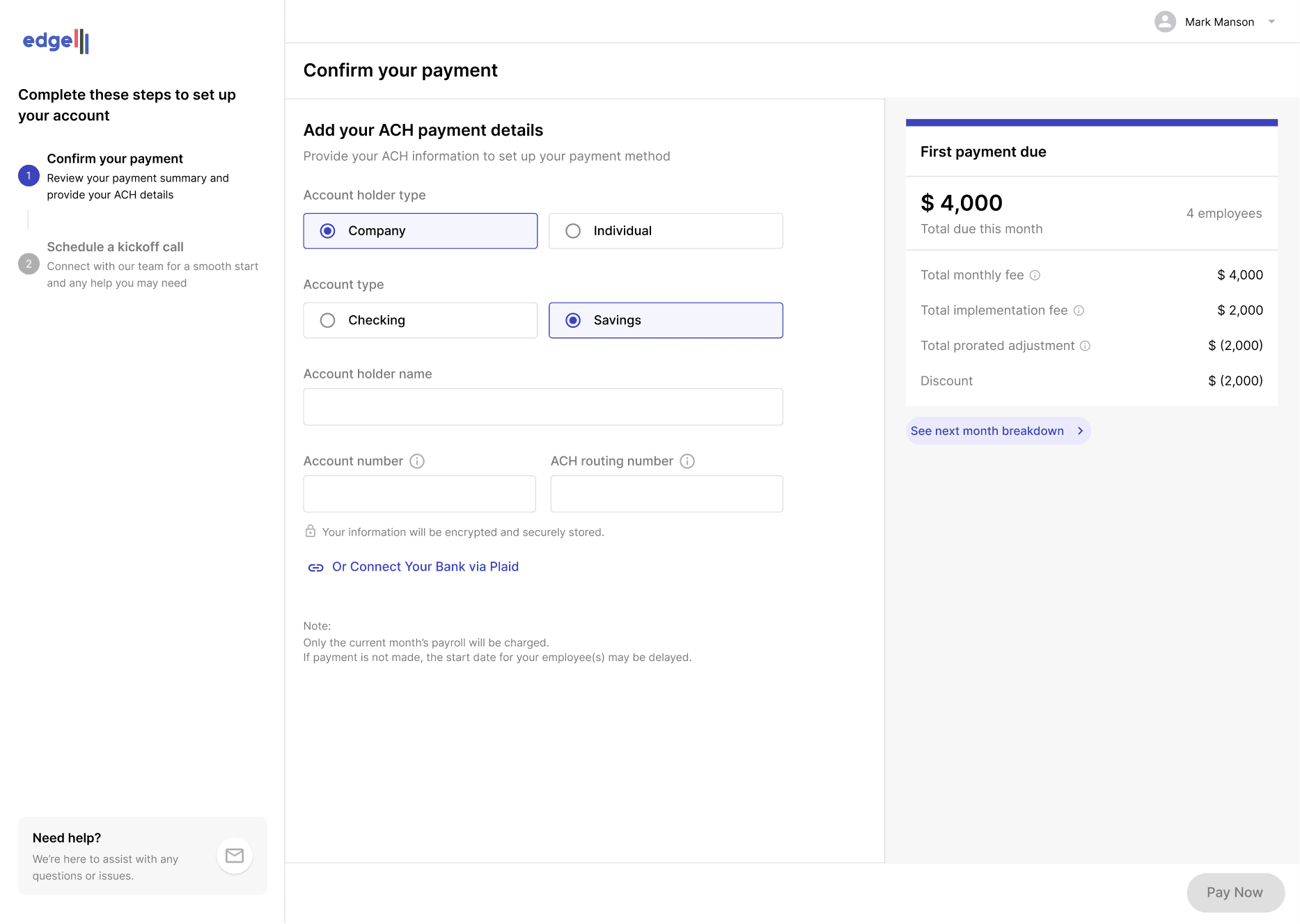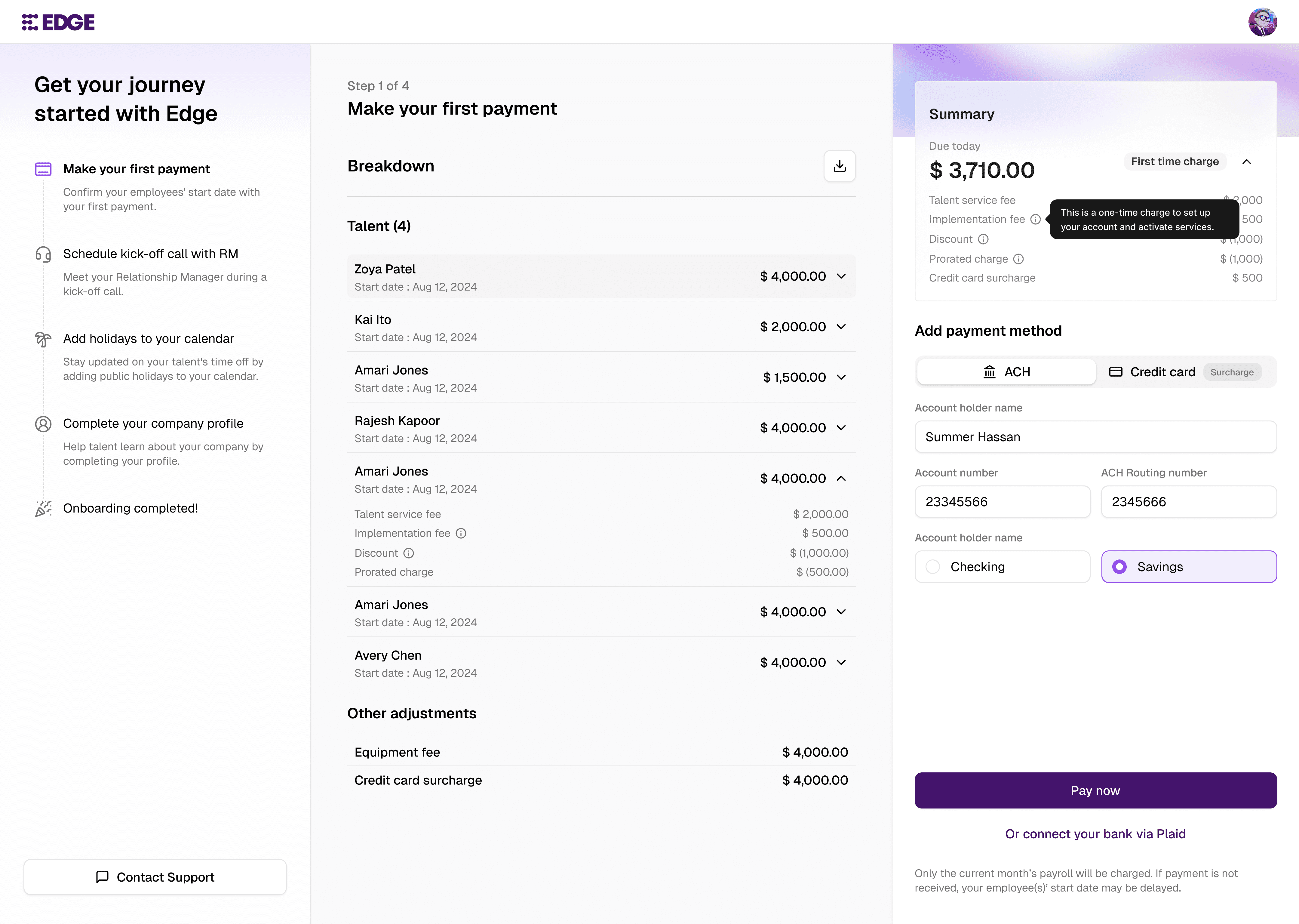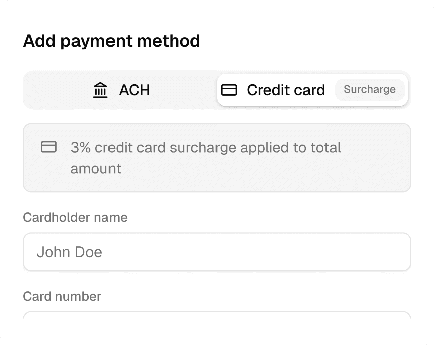 Edge previously only offered ACH as the payment method on the front-end interface. If customers insisted on using a credit card, we would enable that option manually, which was a lengthy process. As part of the revamp, we now ensure customers are clearly informed that a surcharge will be added when paying by credit card.