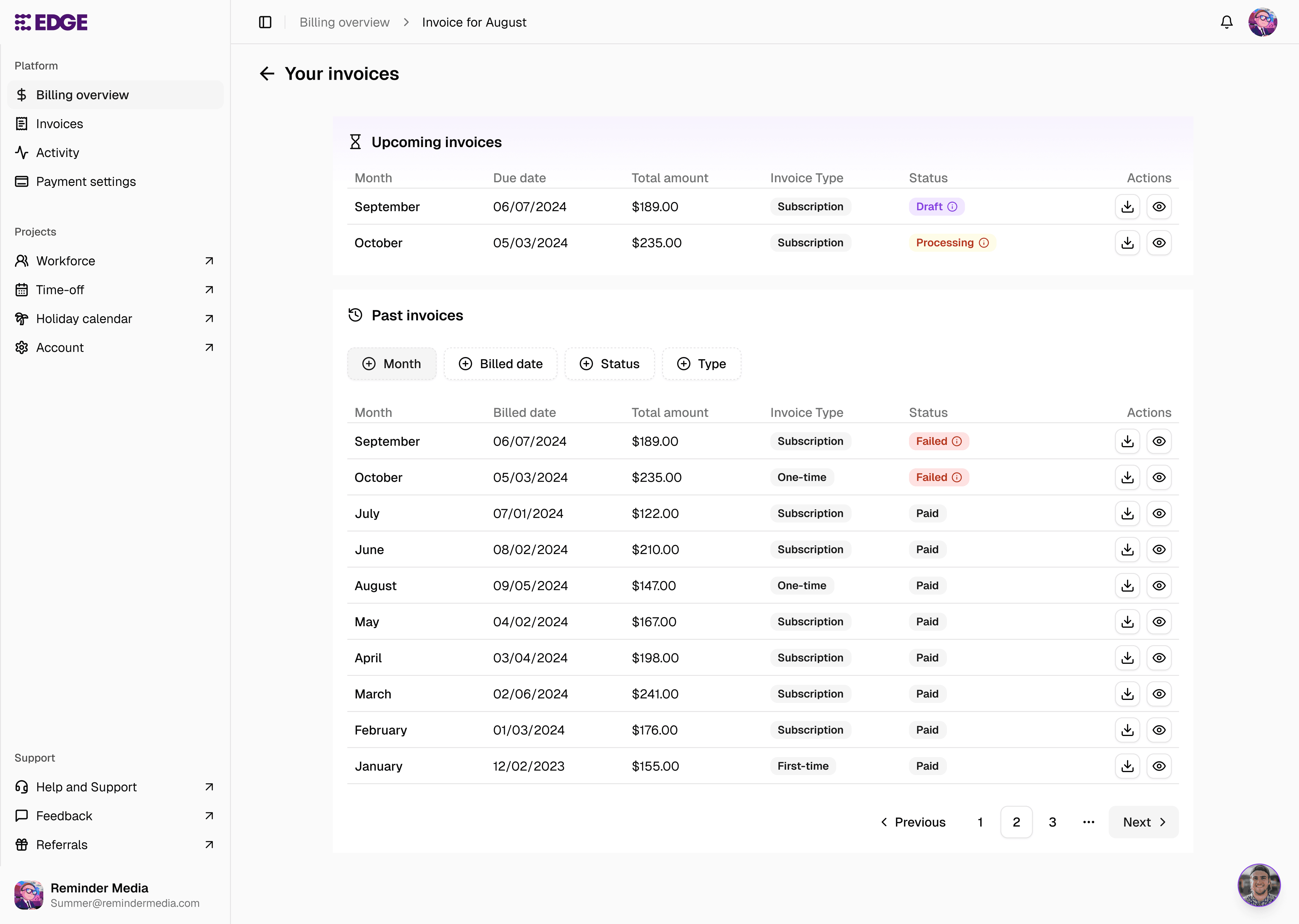 Taking inspiration from basic billing screens, the new approach will just focus on invoices. The main home screen will have just a subscription detail along with upcoming invoice.