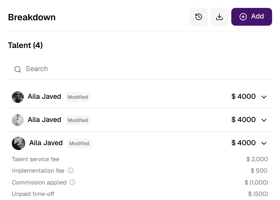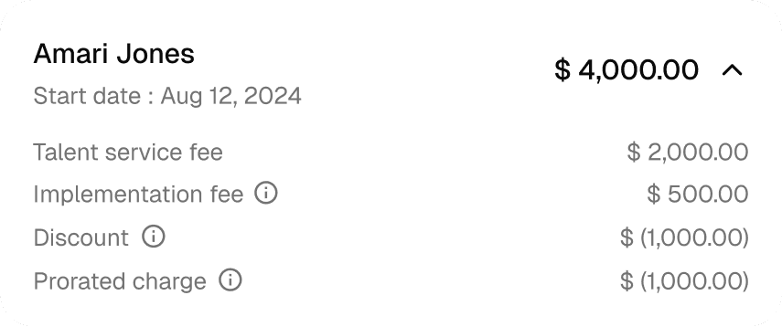 Each talent may have different start dates and accordingly their fee would be prorated. This type of breakdown was not available at the time of onboarding.