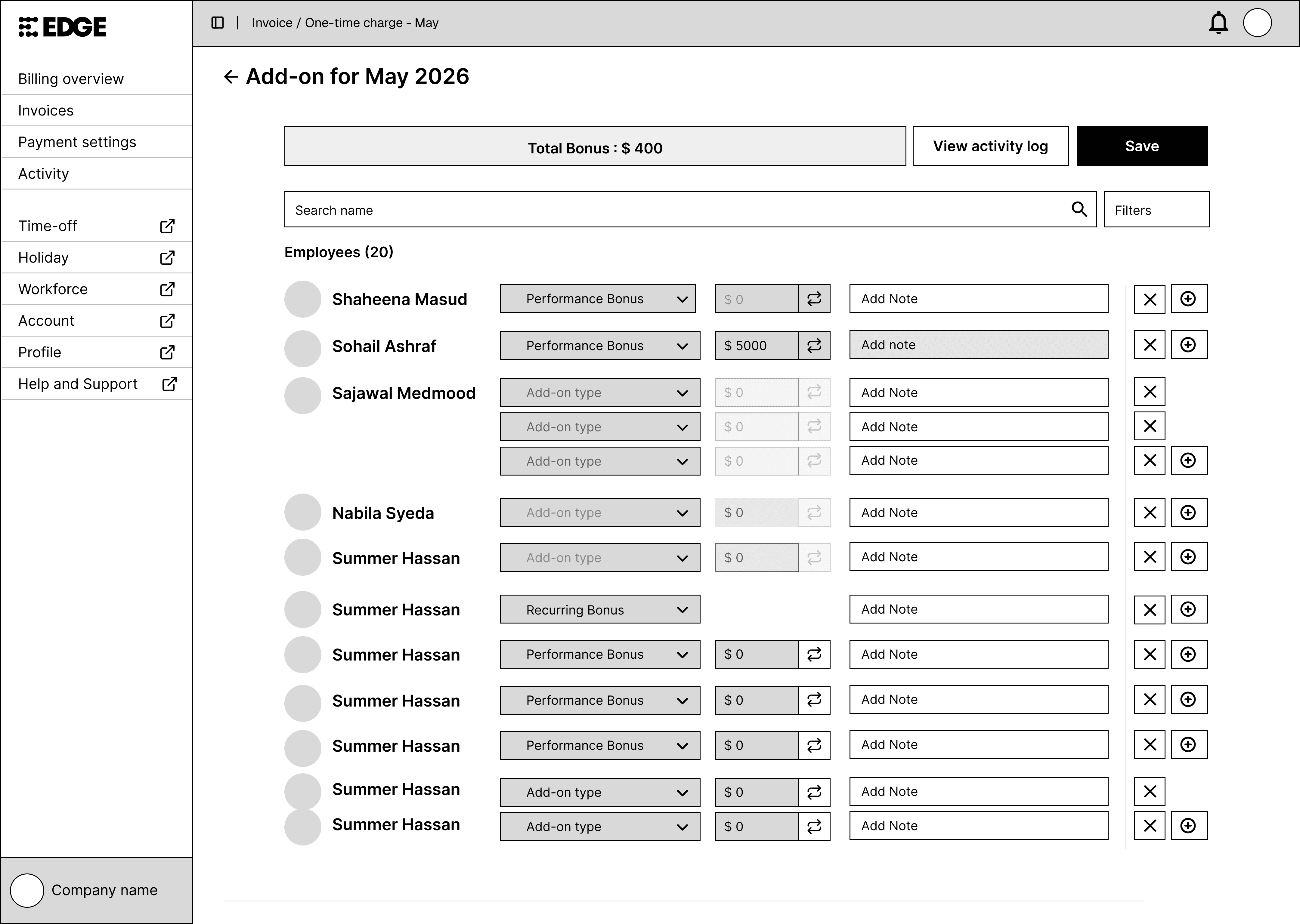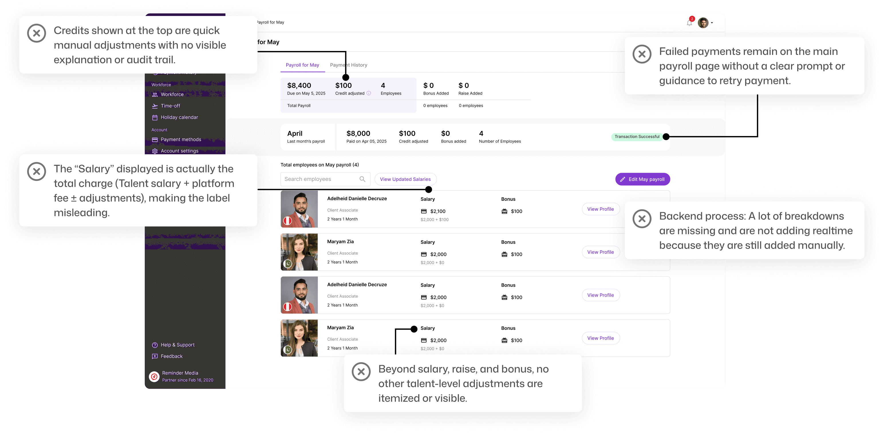 Non-payroll items (e.g., platform fees) included in payroll invoices, reducing transparency and trust.