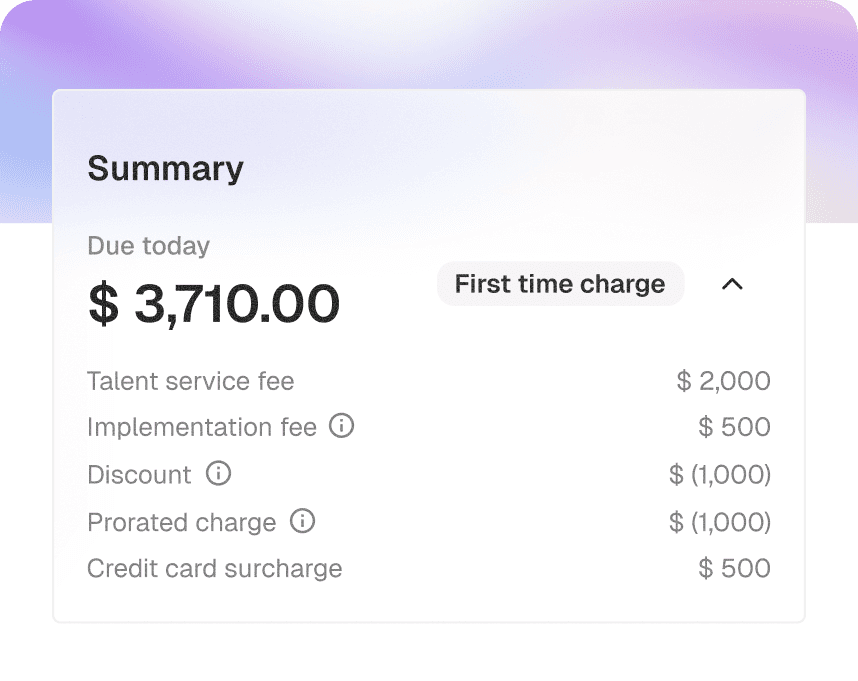 Clear invoice categorization: first-time charges, one-time charges, and subscription charges.