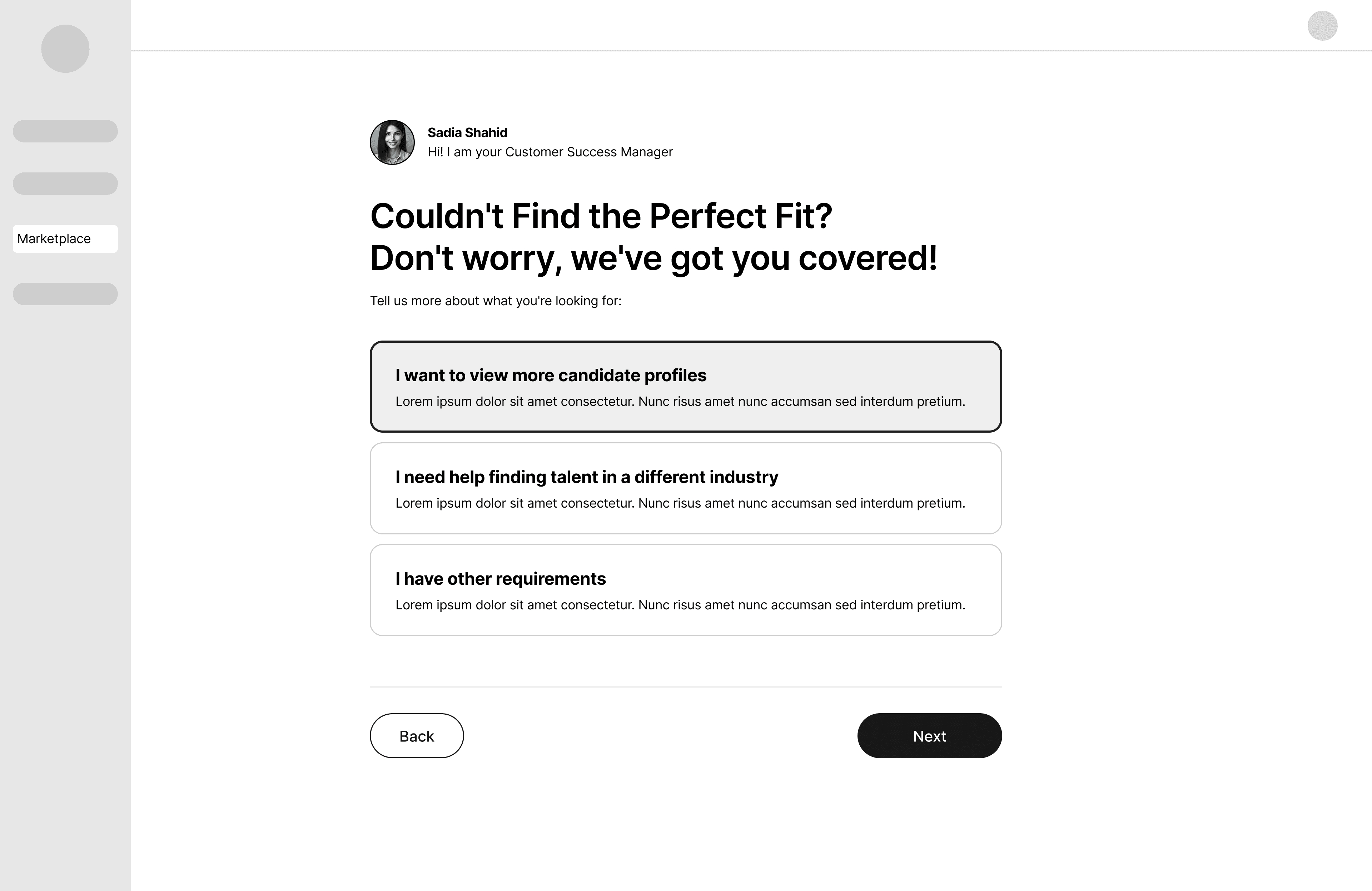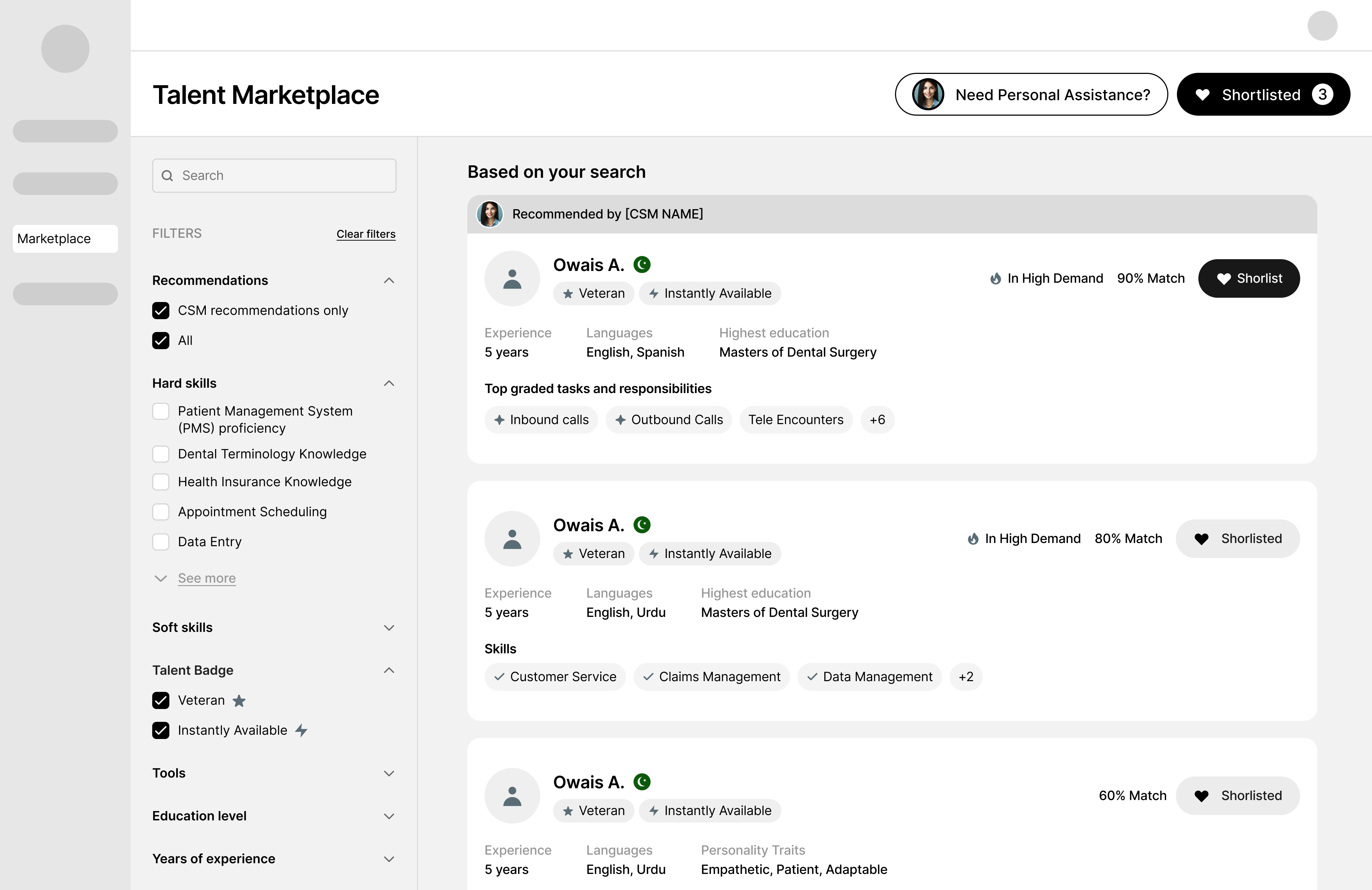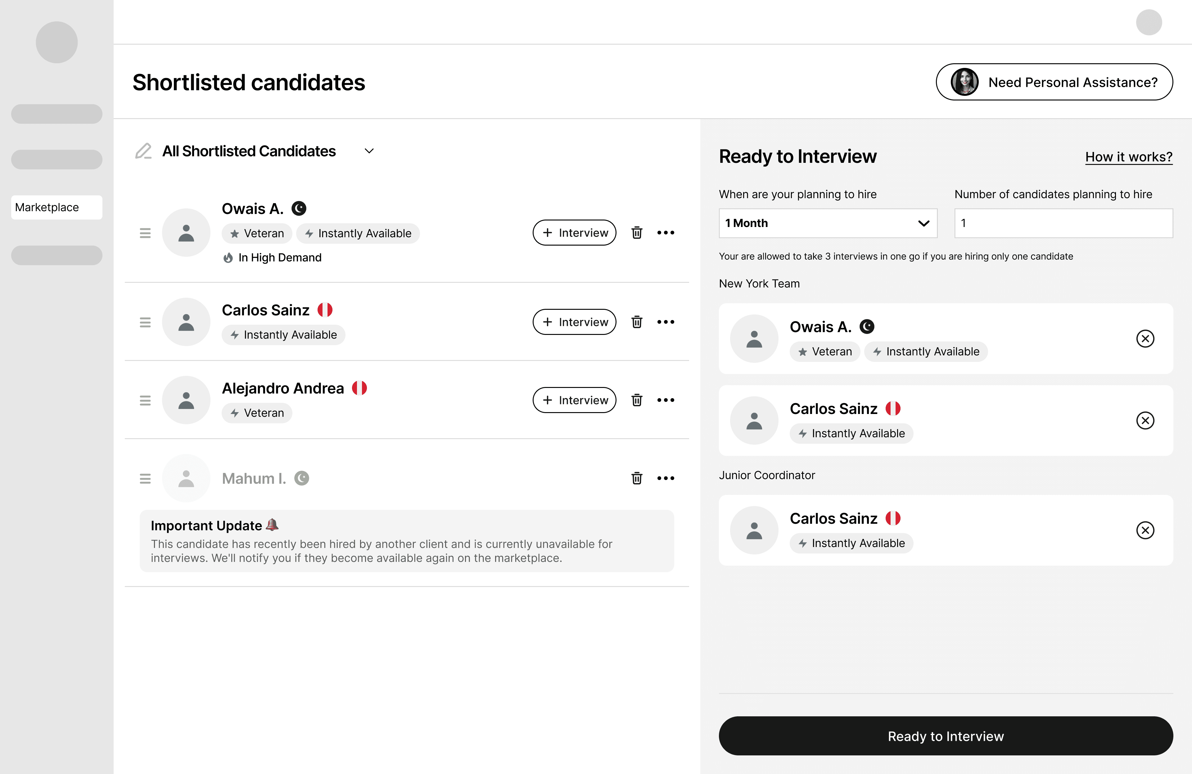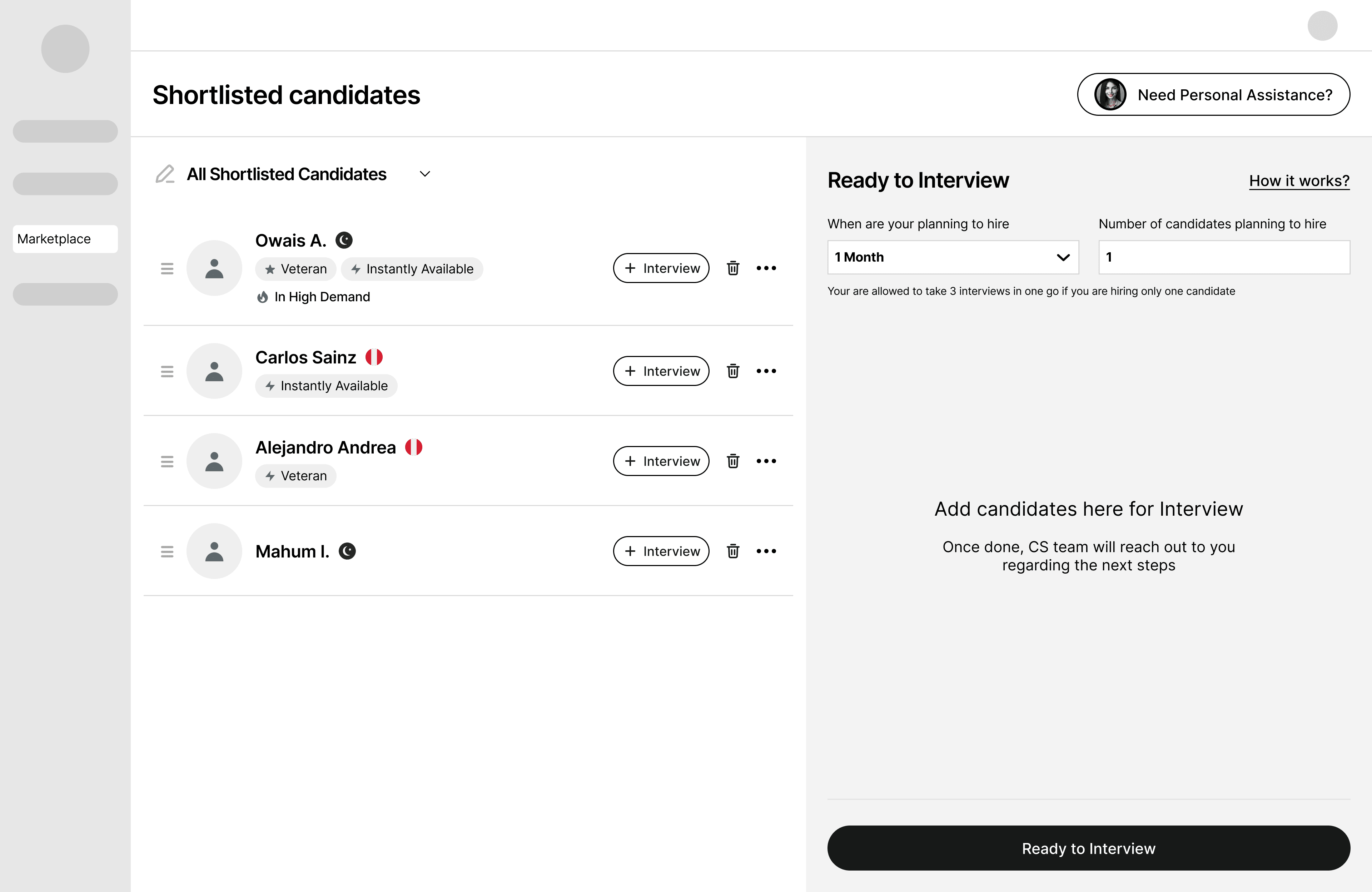 Sales rep will share requirements via salesforce to the Marketplace team who will find top three candidates that customer can interview in their excel sheet