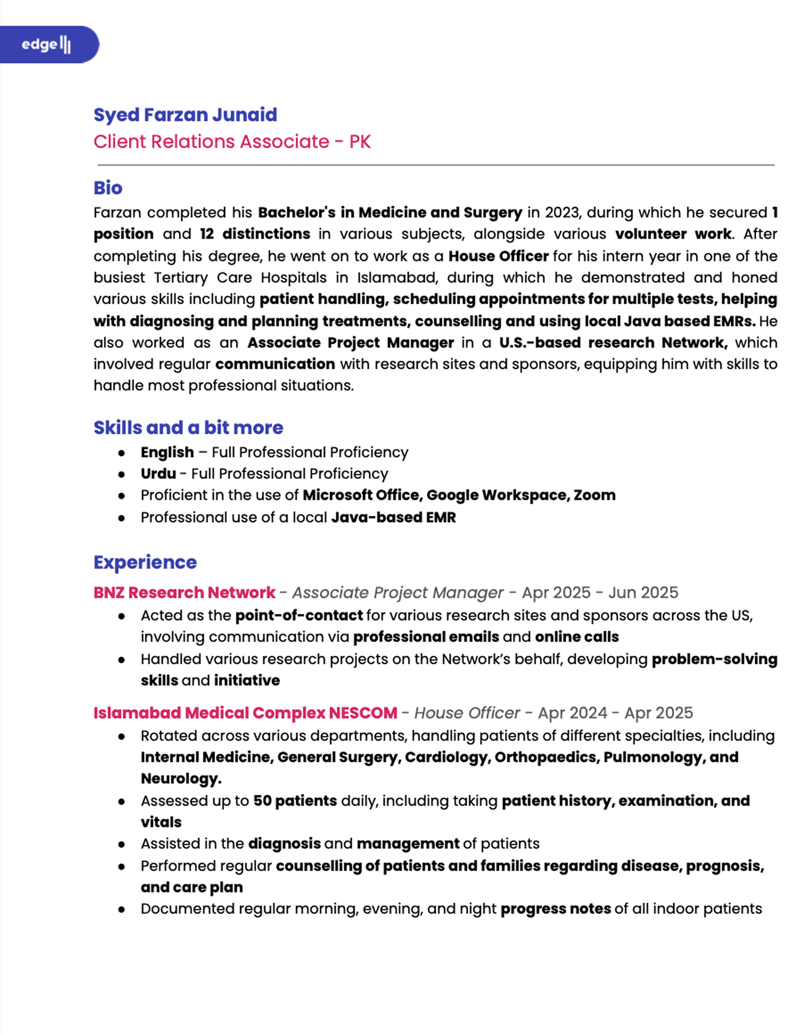 Edge may have talent in marketplace that is highly experienced working with Edge clients in the past. Placing them first is top priority.