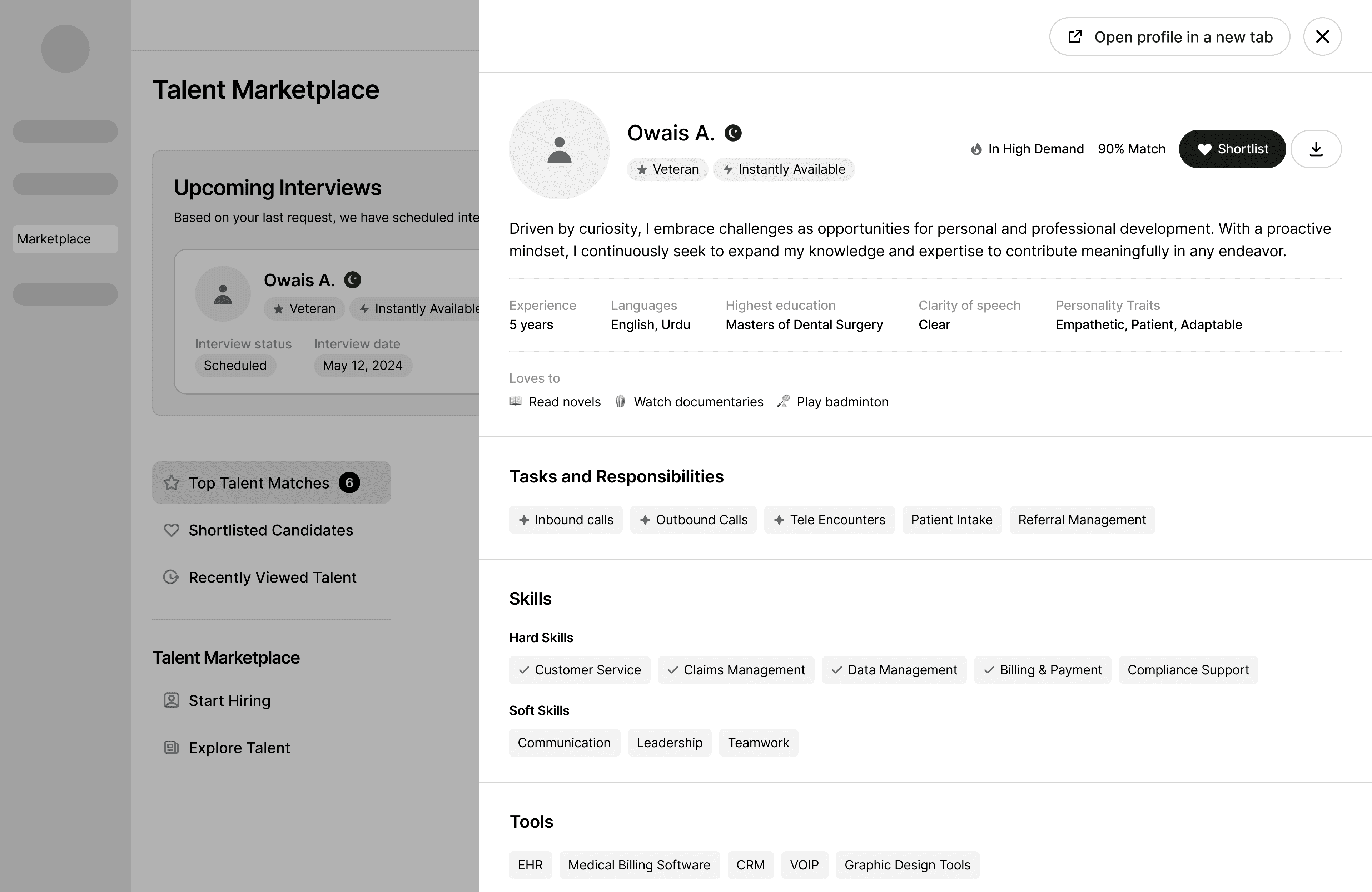 How do customers shortlist and conduct interviews with the talent?